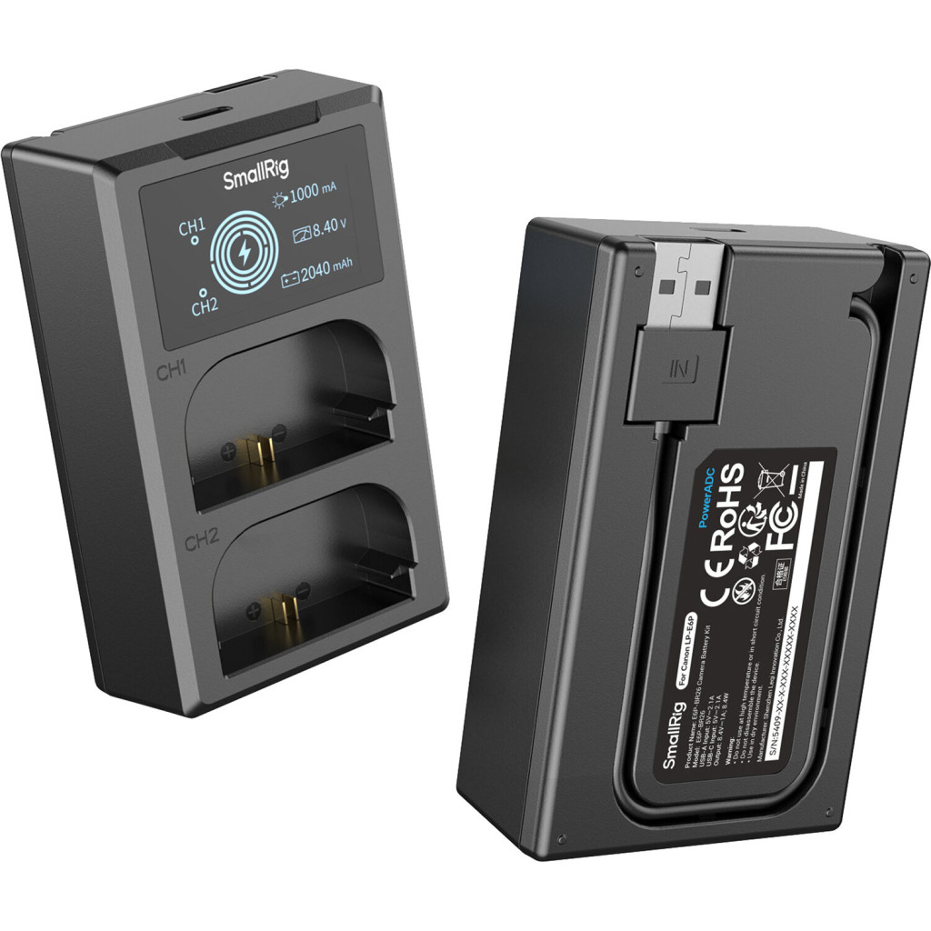A SmallRig E6P-BR26 fényképezőgép akkumulátor és töltő készlet (5409) teljes dekódoló chippel rendelkezik, amely teljes kompatibilitást biztosít a Canon LP-E6P fényképezőgépekkel, beleértve az EOS R5 II-t is.