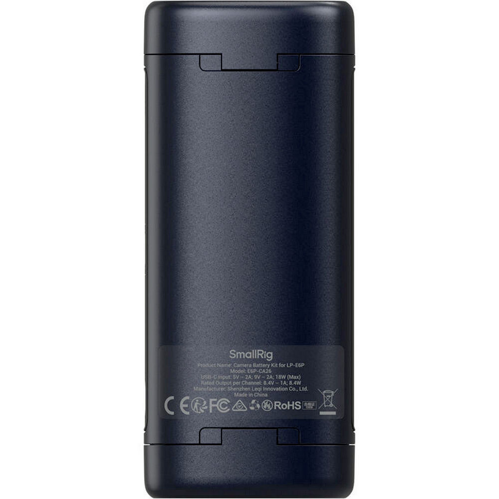 A Canon LP-E6P akkumulátorokkal kompatibilis SmallRig hordozható dupla rekeszes fényképezőgép akkumulátortöltő 2,5 óra alatt képes egyszerre feltölteni mind a gyári, mind a harmadik féltől származó akkumulátorokat.